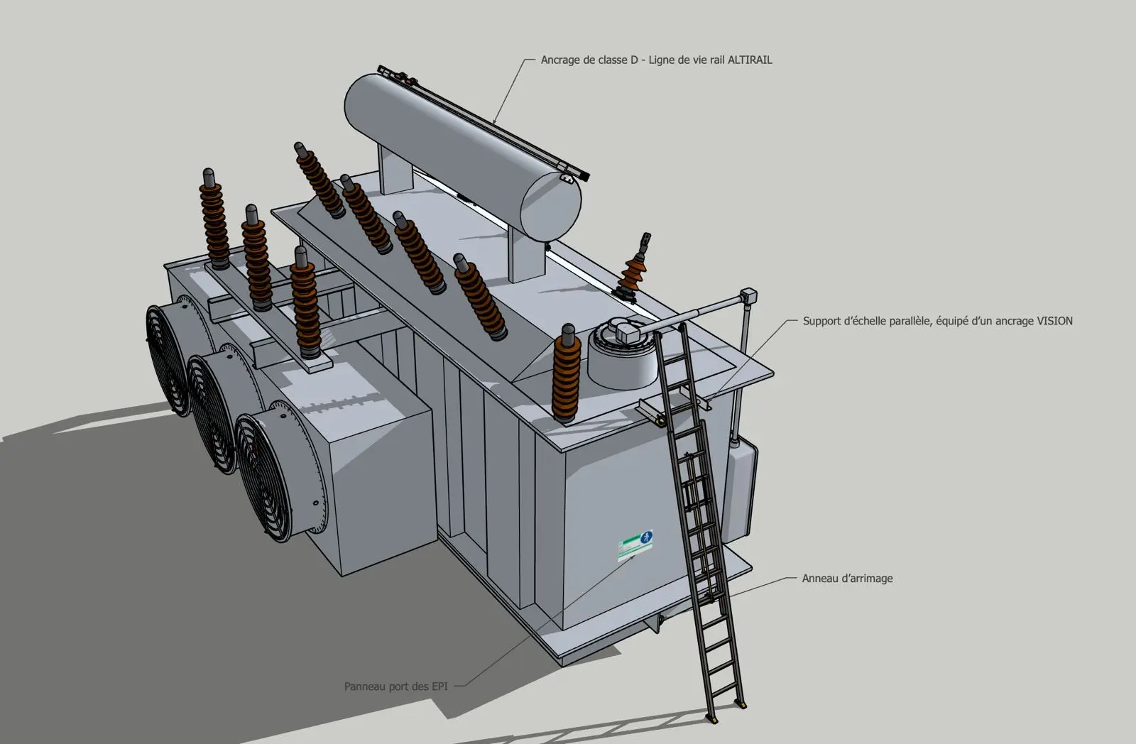 - Des protections individuelles : lignes de vie, points d’ancrage, embase…